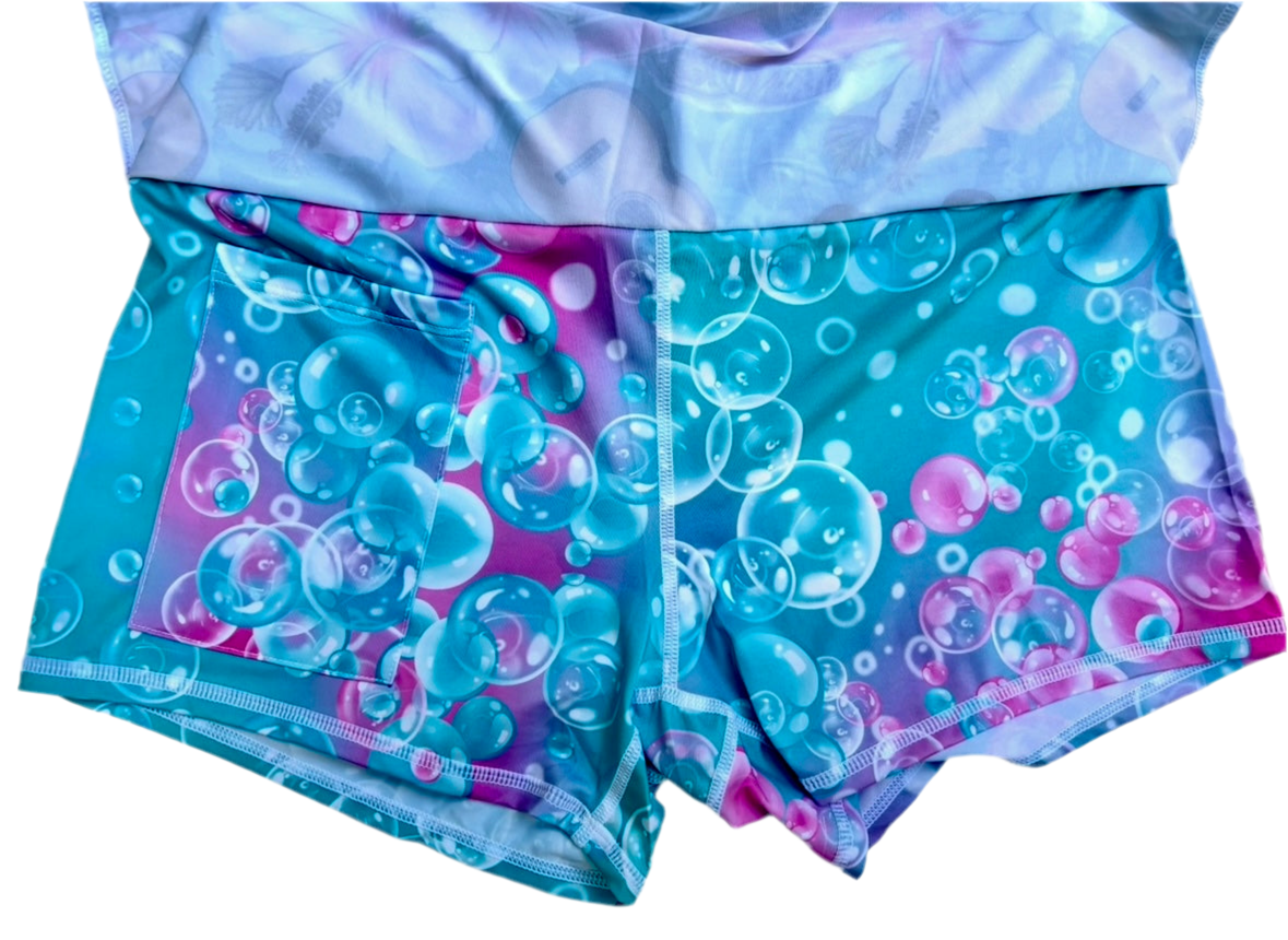 Guitars & Cadillacs, Hillbilly Music, this skort has it all! Signature Elvis pink Cadillac, tropical flowers, guitars and fun bubble britches make this a design for all ages!!
