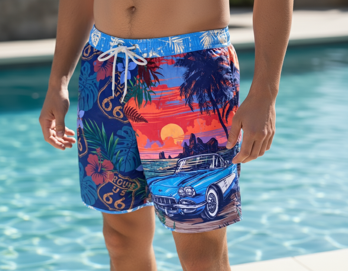 Our new car design is the Sunset ‘Vette. Featuring a Route 66 design with a classic convertible corvette set in front of an ocean sunset.
