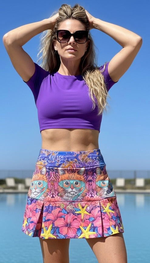 Snorkeling never looked so cute! Coral, purple fish and the most adorable cats in snorkel masks. Available in our standard length: 14” small and medium and 16 inches in large and XL.
